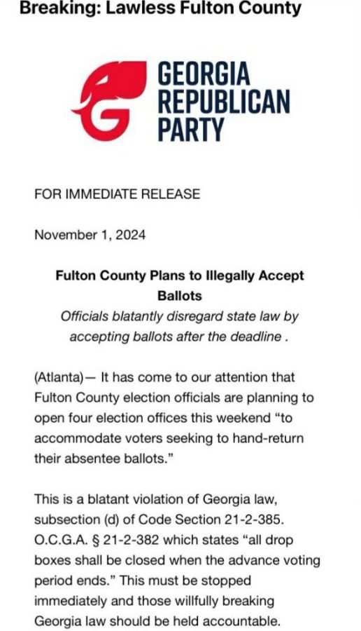 On Friday night, the Georgia Republican Party accused Fulton County officials of planning to “illegally” accepting ballots after the deadline had passed. “It has come to our attention that Fulton County election officials are planning to open four election offices this weekend ‘to accommodate voters seeking to hand-return their absentee ballots.’ This is a blatant violation of Georgia law, subsection (d) of Code Section 21-2-385, O.C.G.A. § 21-2-382 which states ‘all drop boxes shall be closed when the advance voting period ends,’” the release states.