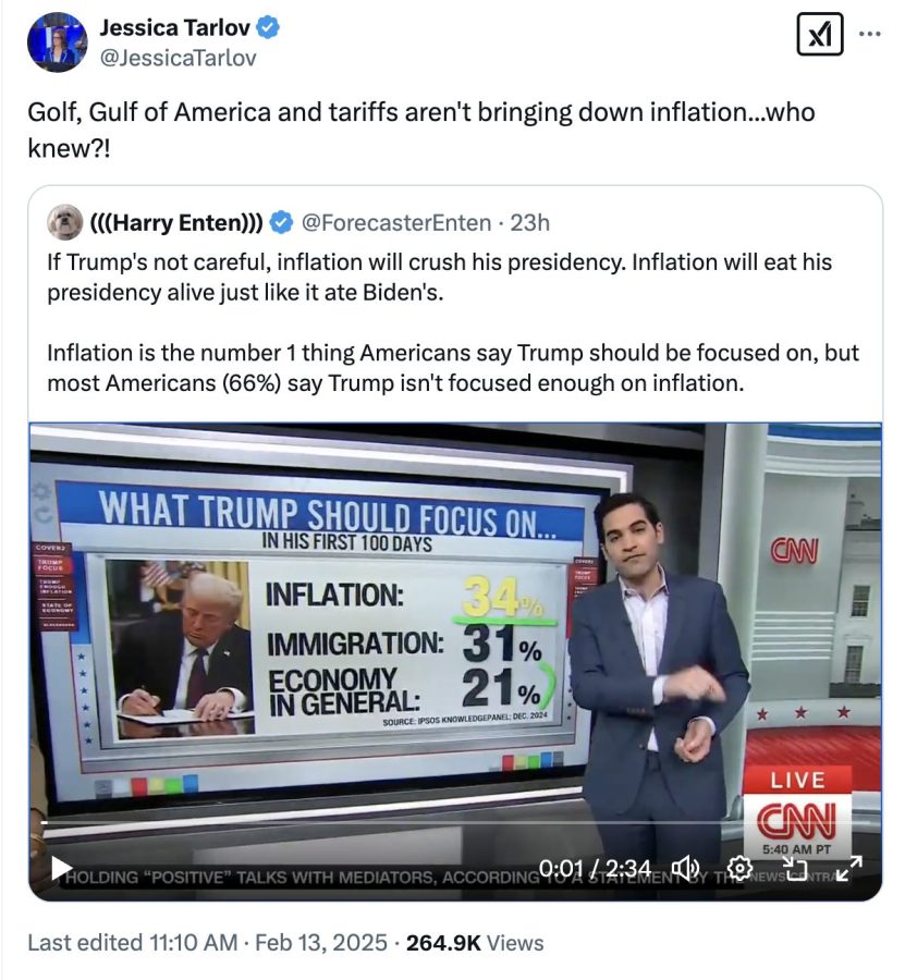 “Golf, Gulf of America and tariffs aren’t bringing down inflation…who knew?!” snapped “The Five” host in response to CNN analyst Harry Enten’s explanation on new Treasury data showing that inflation ticked up to 3% in the month of January. Thirty-four percent of Americans continue to rank inflation as the most salient issue for Trump’s focus over his first year back in office.