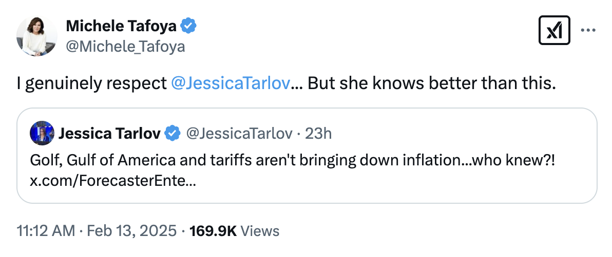 Tafoya wasn’t “pretending,” she countered. “I respect how you hold your own on @TheFive,” she said. “But after 3.5 weeks, you’re willing to blame the rise in inflation on the new admin? That is where you should know better. For 4 years your party told us inflation was ‘transitory,’ etc. But after four weeks, it’s now the fault of the White House?”