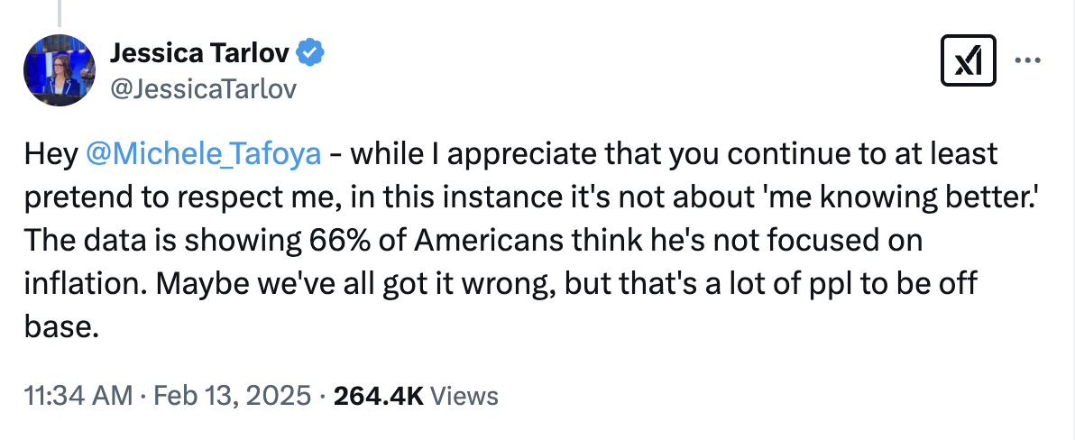 “Hey Michele, while I appreciate that you continue to at least pretend to respect me, in this instance it’s not about ‘me knowing better.’ The data is showing 66% of Americans think he’s not focused on inflation. Maybe we’ve all got it wrong, but that’s a lot of ppl to be off base,” she replied.