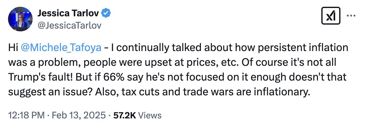 “I continually talked about how persistent inflation was a problem, people were upset at prices, etc. Of course it’s not all Trump’s fault! But if 66% say he’s not focused on it enough doesn’t that suggest an issue? Also, tax cuts and trade wars are inflationary,” she argued.