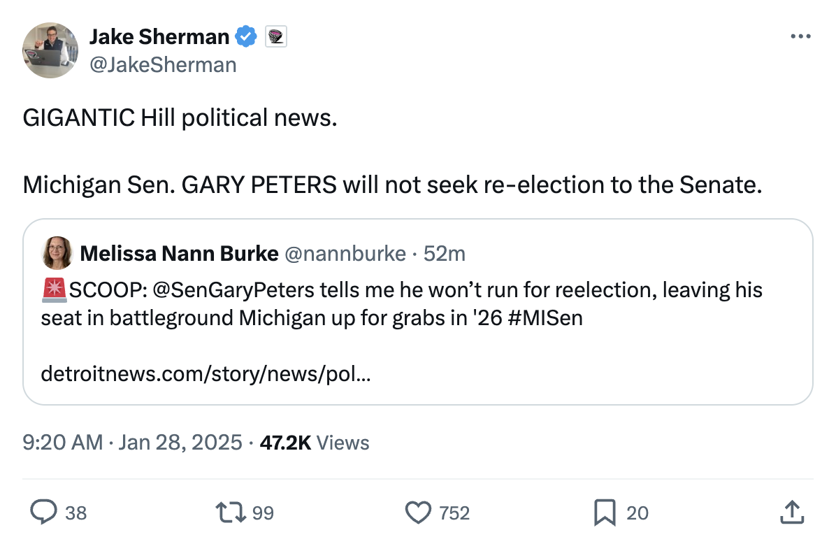 One incumbent not on that list, however, is Sen. Gary Peters (D-MI), who told the Detroit News that he will not seek reelection in 2026. The two-term senior senator of Michigan said he is ready to begin a “new chapter” in retirement.