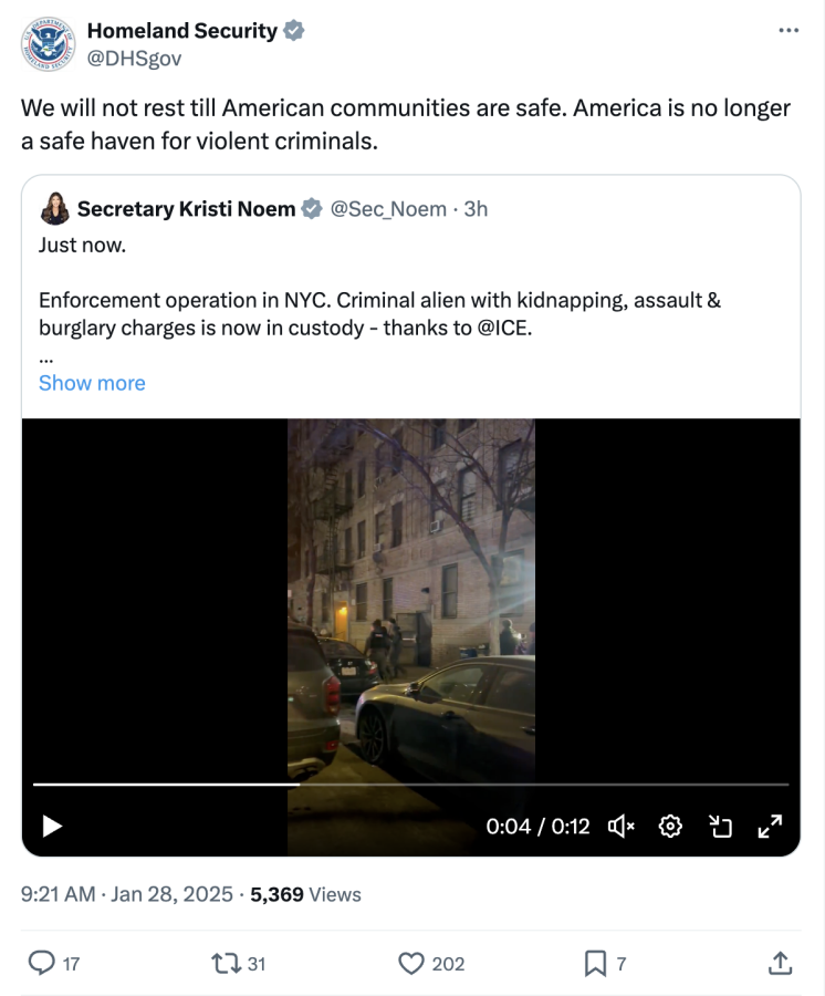 Noem was confirmed by the U.S. Senate in a 59-34 vote that saw seven Democrats break rank and vote to confirm the former South Dakota governor to head up DHS. Noem’s agency echoed her message in a post of its own announcing the New York enforcement action.