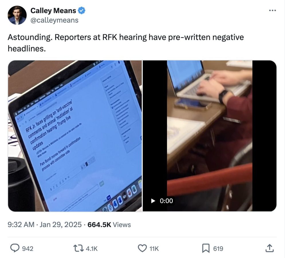 Calley Means, an entrepreneur and author, shared footage and a screenshot of a laptop being frantically worked by a reporter in the empty hearing room. Zooming in on the screen, Means showed off the scurrilous working title, “RFK Jr. faces grilling on ‘anti-vaccine’ comments and animal ‘mutilation’ at confirmation hearing.”