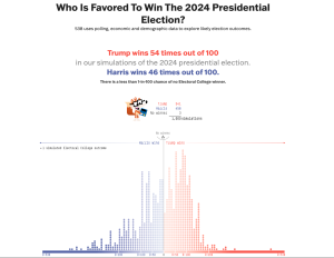 In FiveThirtyEight’s simulations, Trump wins 54 times out of 100, while Harris wins 46 times. There is also a slim chance—less than 1 in 100—that no candidate secures the necessary 270 electoral votes, potentially pushing the decision to the House of Representatives. Such an outcome would be a historic scenario not seen since the 19th century.