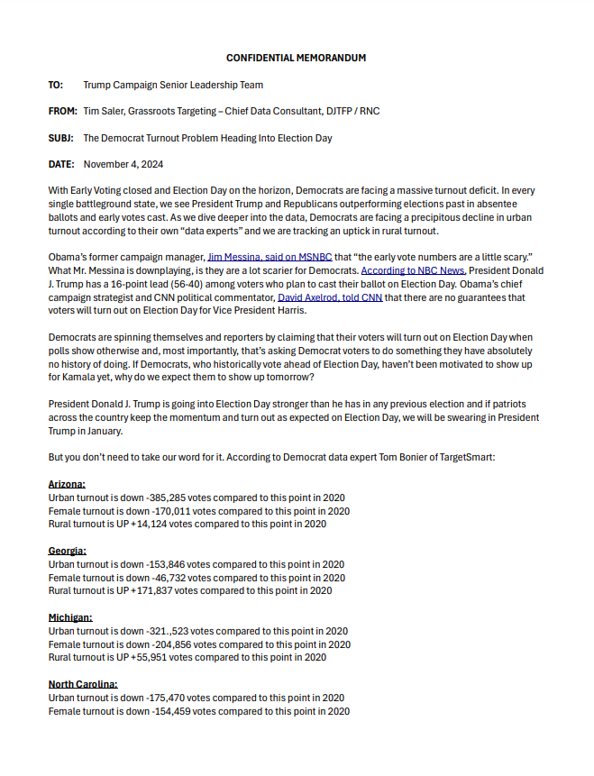A newly released Trump-Vance campaign memo detailed several major red flags for Democrats in urban and female turnout, two demographics that are widely considered essential to a Democrat victory on Tuesday.