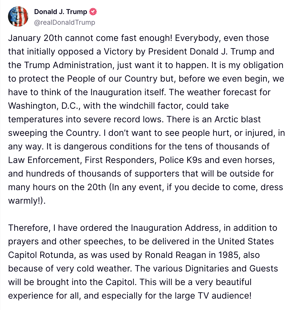 “Therefore, I have ordered the Inauguration Address, in addition to prayers and other speeches, to be delivered in the United States Capitol Rotunda.”