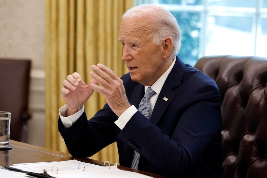 U.S. President Joe Biden speaks to members of the news media while receiving a briefing about the ongoing wildfire season in the Oval Office at the White House on September 17, 2024 in Washington, DC.