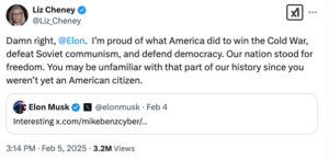 Cheney, rather than ignoring the growing discourse, opted to engage Musk directly. “Damn right, @Elon. I’m proud of what America did to win the Cold War, defeat Soviet communism, and defend democracy.”