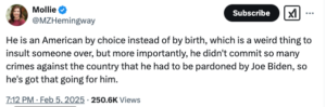 Notably, columnist Mollie Hemingway dismantled Cheney’s argument with a sharp retort: “He is an American by choice instead of by birth, which is a weird thing to insult someone over, but more importantly, he didn’t commit so many crimes against the country that he had to be pardoned by Joe Biden, so he’s got that going for him.”