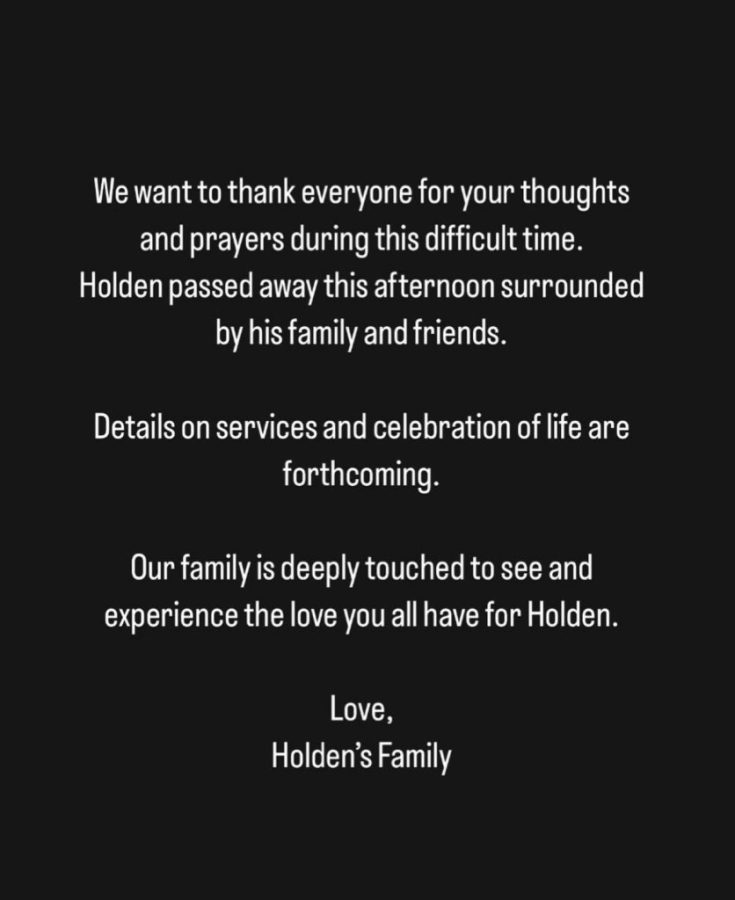 The team did not provide a cause of death, though his family announced that he had been in the intensive care unit in a hospital through Trent’s Instagram page. “We want to thank everyone for your thoughts and prayers during this difficult time,” the family said in a follow-up statement, adding that Holden passed away while surrounded by family and friends.