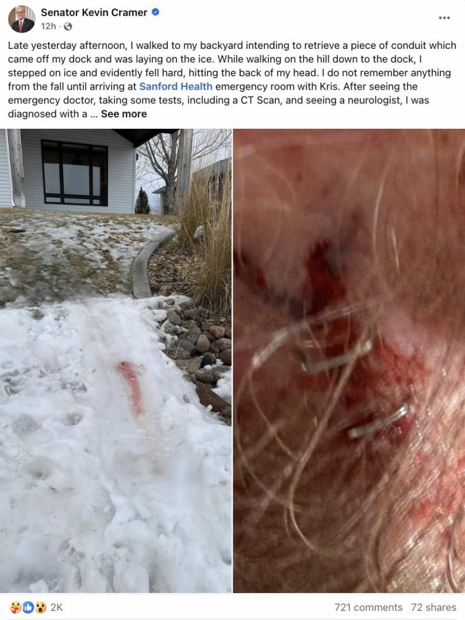 Sen. Kevin Cramer (R-ND) was walking outside his Bismarck home when he slipped on a patch of black ice and fell, hitting his head on a hardened sloped hill. He said he couldn’t remember anything about the accident until he regained consciousness at the city’s Sanford Health hospital with his wife, Kris.