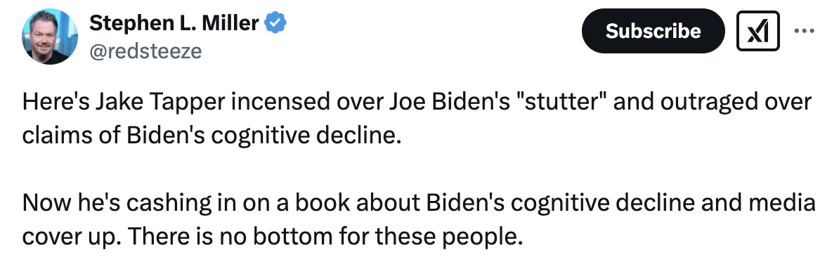 “Here’s Jake Tapper incensed over Joe Biden’s ‘stutter’ and outraged over claims of Biden’s cognitive decline,” he wrote on X. “Now he’s cashing in on a book about Biden’s cognitive decline and media cover up. There is no bottom for these people.”