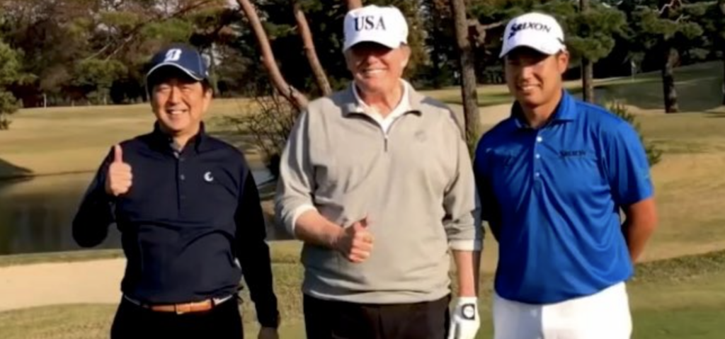 Trump golfs with Abe and Masters winner Hideki Matsuyama in 2017