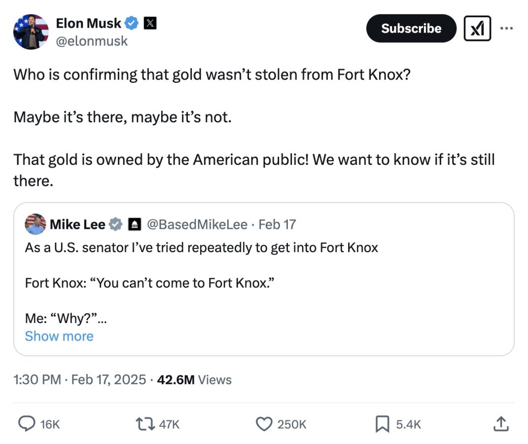 “Who is confirming that gold wasn’t stolen from Fort Knox? Maybe it’s there, maybe it’s not. That gold is owned by the American public! We want to know if it’s still there,” Musk wrote on X, sharing a similar post by Sen. Mike Lee (R-UT), who said he had been denied access to the facility previously.