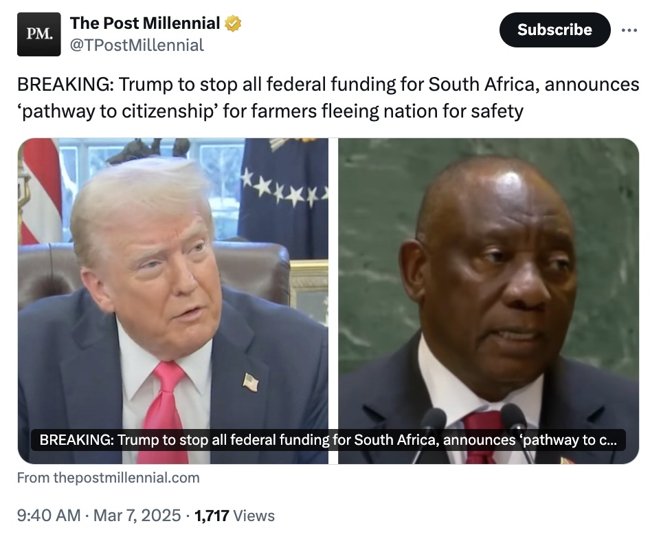“South Africa is being terrible, plus, to long time Farmers in the country. They are confiscating their LAND and FARMS, and MUCH WORSE THAN THAT. A bad place to be right now, and we are stopping all Federal Funding,” Trump wrote. “To go a step further, any Farmer (with family!) from South Africa, seeking to flee that country for reasons of safety, will be invited into the United States of America with a rapid pathway to Citizenship. This process will begin immediately!”