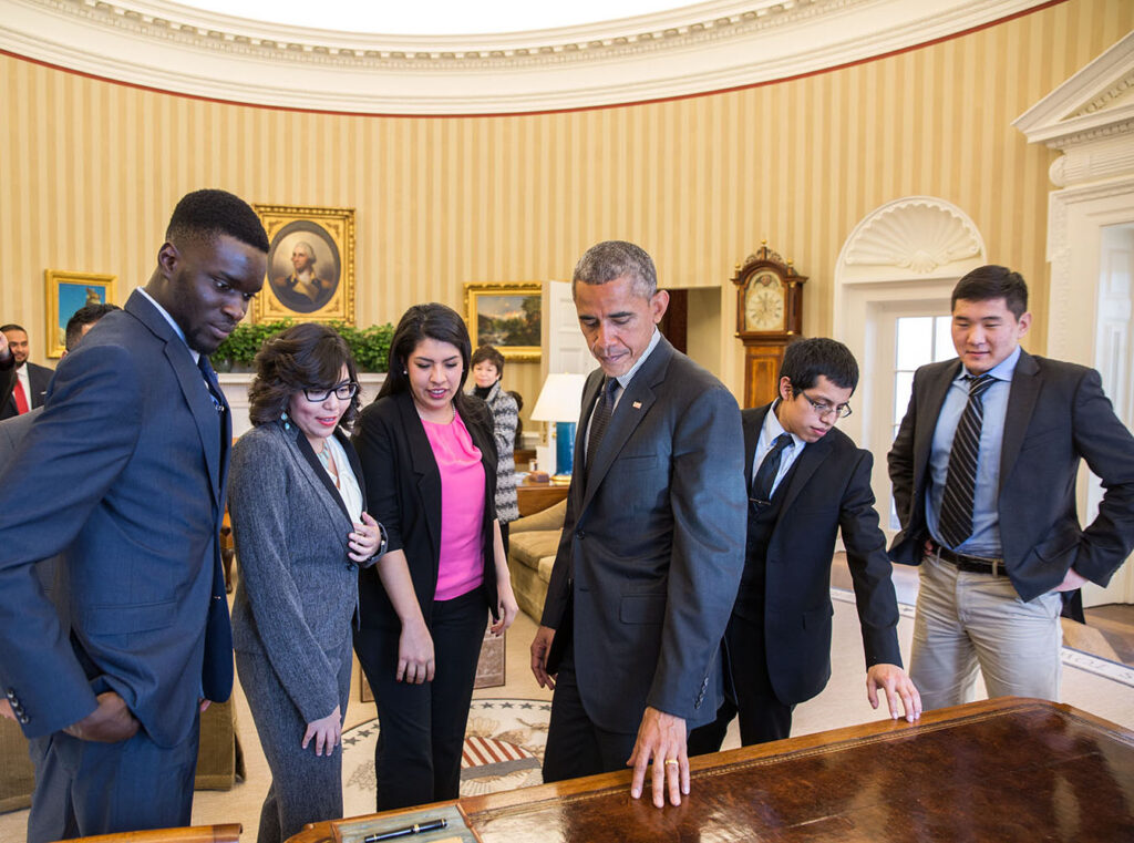President Barack Obama shows the Resolute Desk to a group of DACA beneficiaries while giving them an Oval Office tour. The President met with the group of “DREAMers,” who talked about how they have benefited from Deferred Action for Childhood Arrivals, Feb. 4, 2015. (Official White House Photo by Pete Souza)