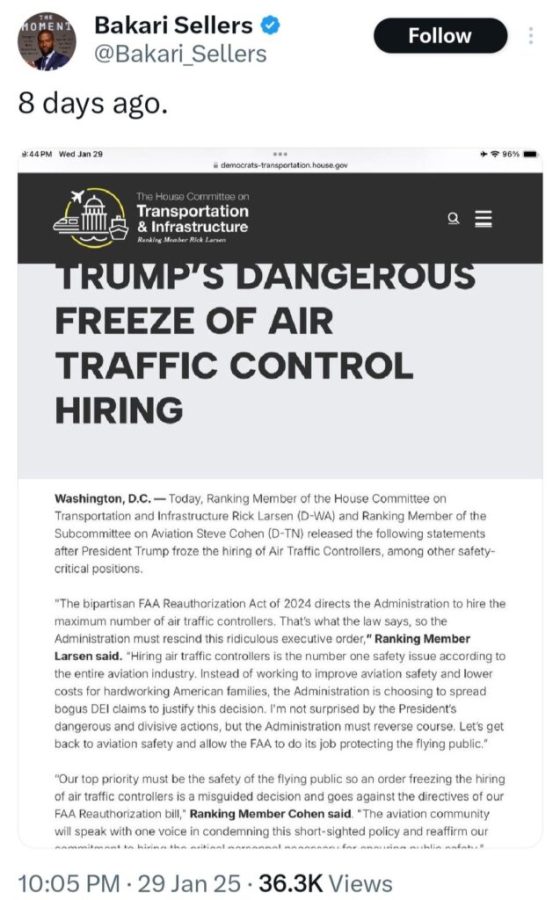 CNN contributor made a similar suggestion, pointing to President Trump’s executive order that instituted a hiring freeze for federal workers. “8 days ago,” Sellers wrote in an X post less than an hour after the crash.