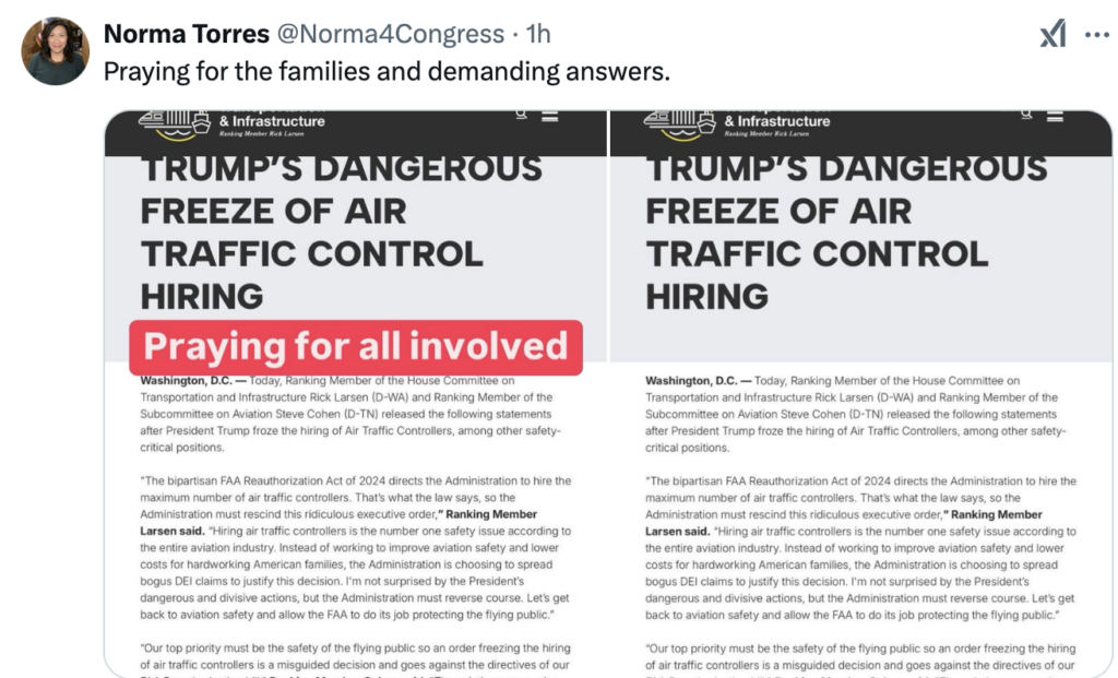 U.S. Rep. Norma Torres (D-CA) also appeared to blame President Trump for the tragedy by pointing to the hiring freeze. “Praying for the families and demanding answers,” she wrote in an X post.