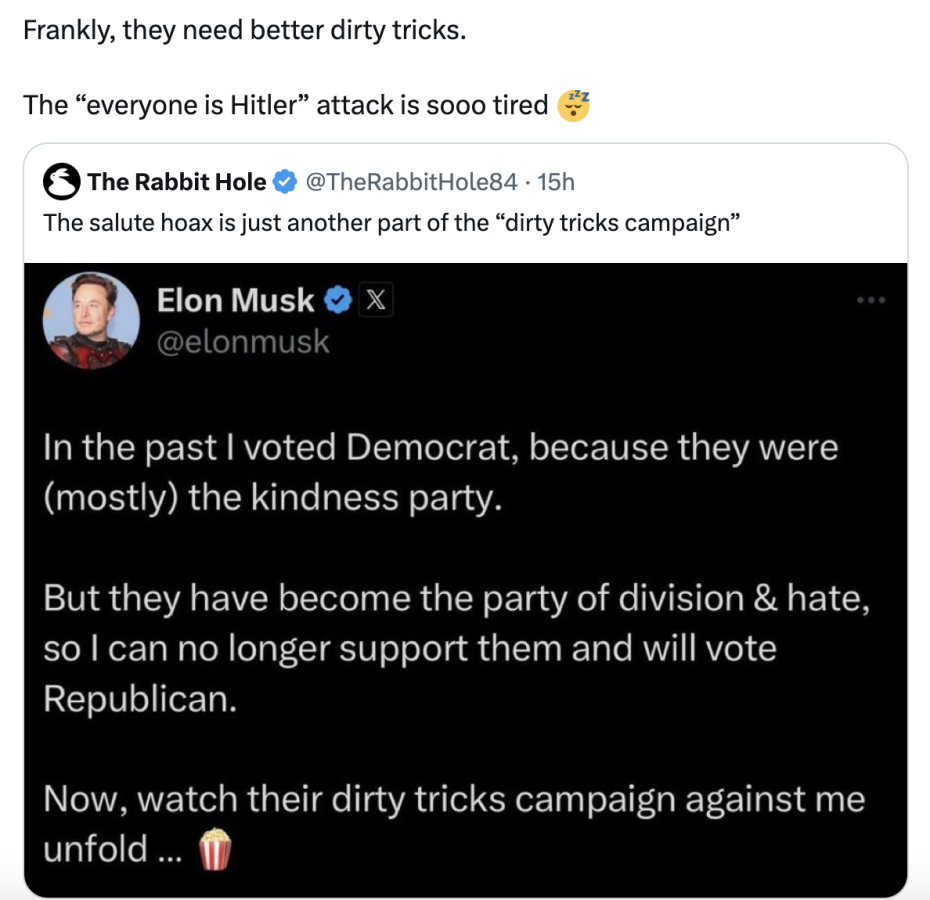 Musk addressed the controversy himself by dismissing the allegations on X. “Frankly, they need better dirty tricks,” he wrote. “The ‘everyone is Hitler’ attack is sooo tired.”