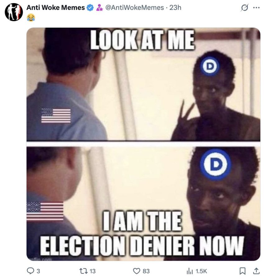 The popular conservative account Libs of TikTok shared the video on X. “I was told that election deniers are the biggest threat to our Democracy…” they wrote.